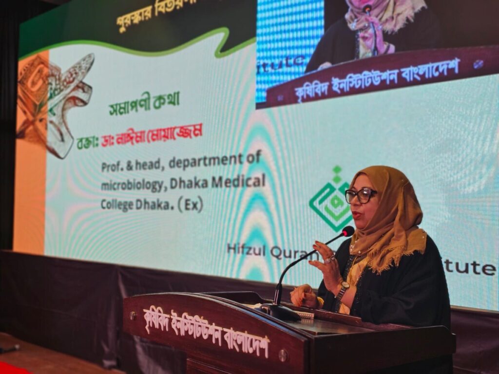 পুরস্কার প্রদান করেন প্রফেসর ড. নাঈমা মোয়াজ্জেম, সাবেক বিভাগীয় প্রধান, মাইক্রোবায়োলজি বিভাগ, ঢাকা মেডিকেল কলেজ।